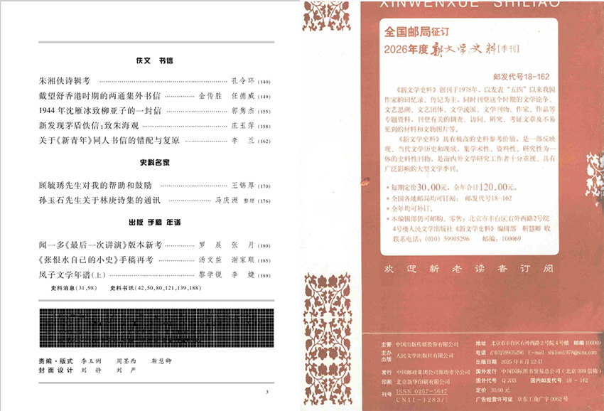 刊物核心定位为“新文学历史的文献载体”,聚焦1917年以来中国现代文学发展脉络,常设“理论思考与探索”“民间文学论坛”“现当代作家作品评论”“古典文学研究”“书评”“调查报告”等栏目。内容上以原始史料为根基,刊登鲁迅、郭沫若、茅盾等重要作家的回忆录、未刊手稿,系统介绍文学研究会、创造社等社团流派的活动轨迹,同时注重口述史、档案文献等鲜活资料的挖掘,为文学史研究提供第一手素材,其史料的真实性与系统性受到学界广泛认可。